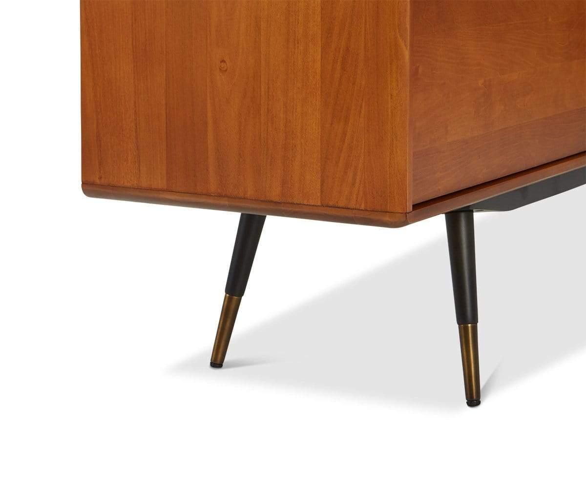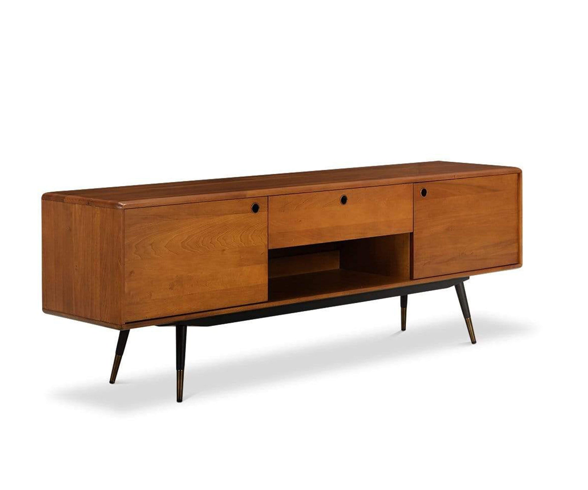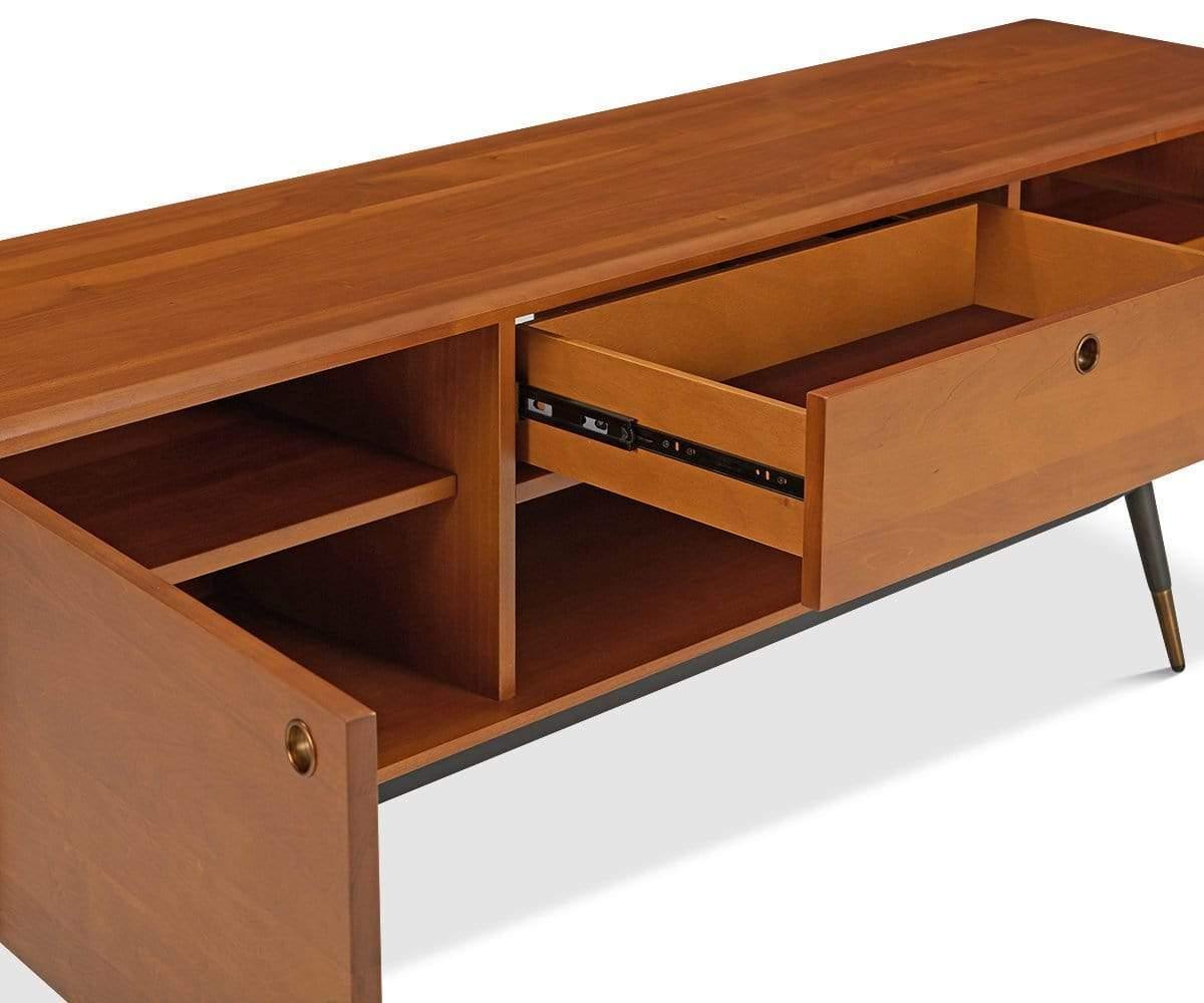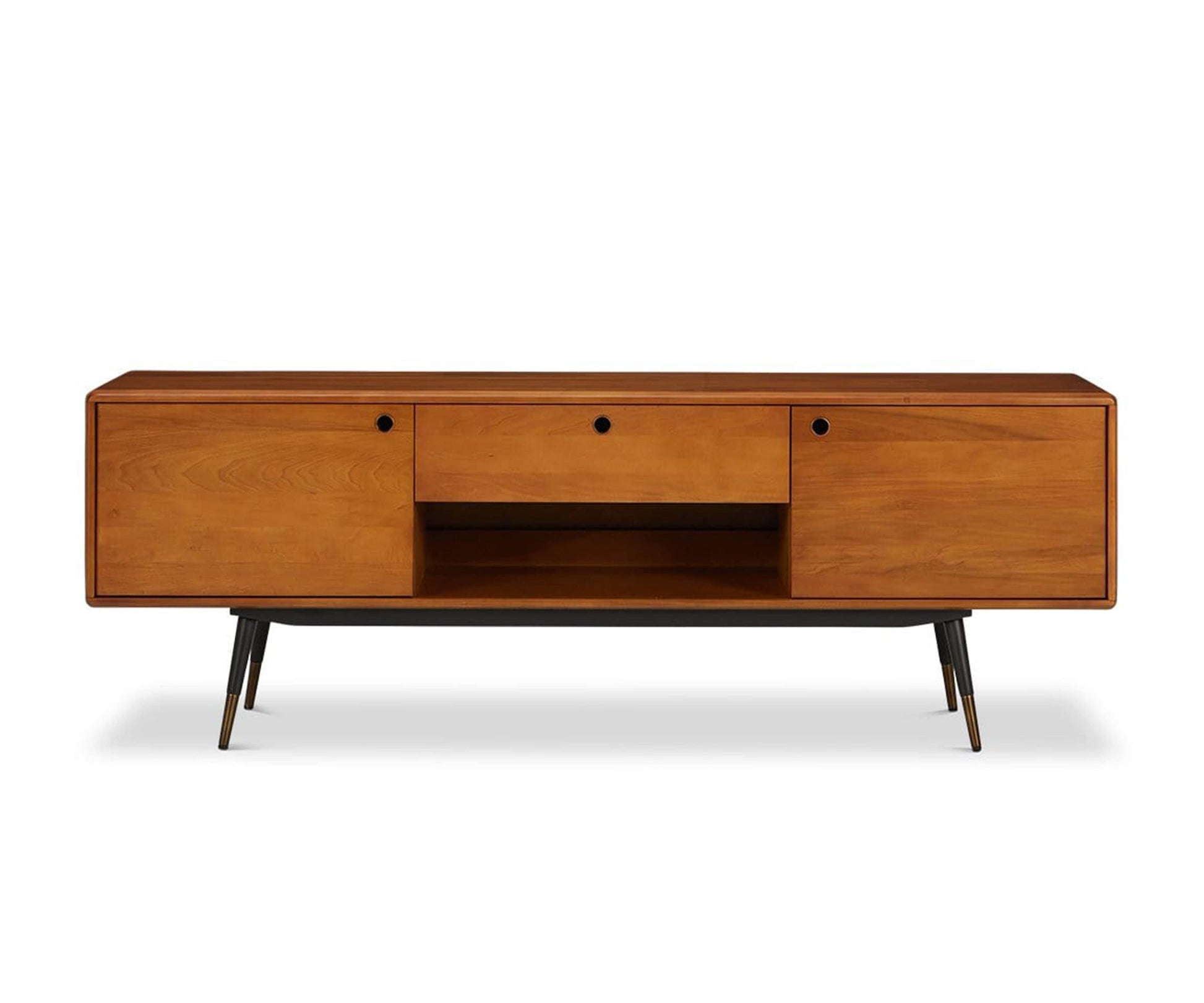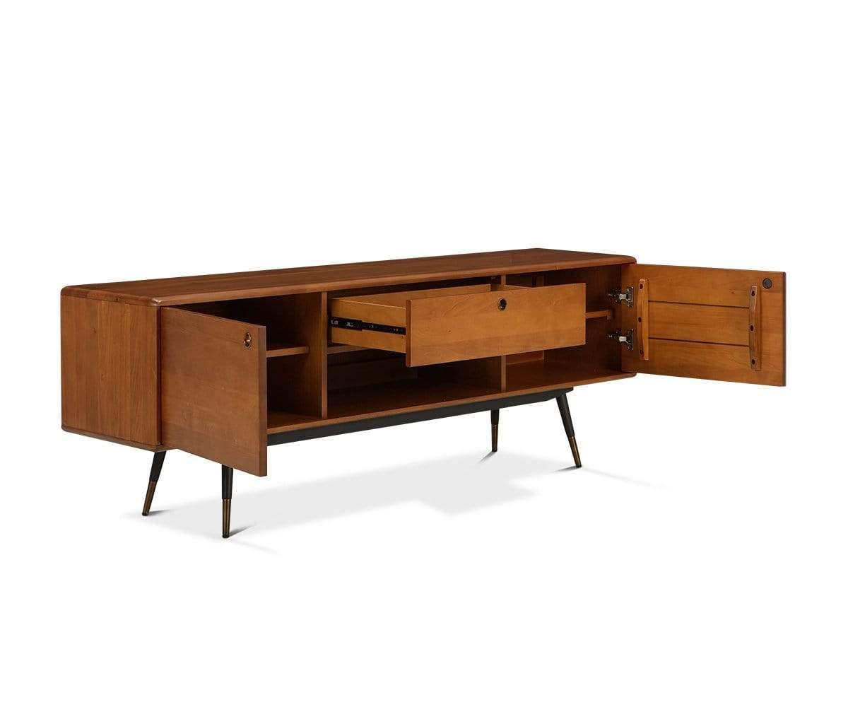 Fabriqué en peuplier américain, le meuble multimédia Lanson est doté de deux portes, d'un grand tiroir et d'un compartiment ouvert, parfaits pour ranger vos essentiels multimédia. Avec son esthétique Mid-Century et ses nombreuses possibilités de rangement, ce meuble multimédia rend tout espace aussi fonctionnel qu'élégant. Des pieds fuselés noirs contrastants, rehaussés d'embouts en laiton massif, complètent son style moderne.