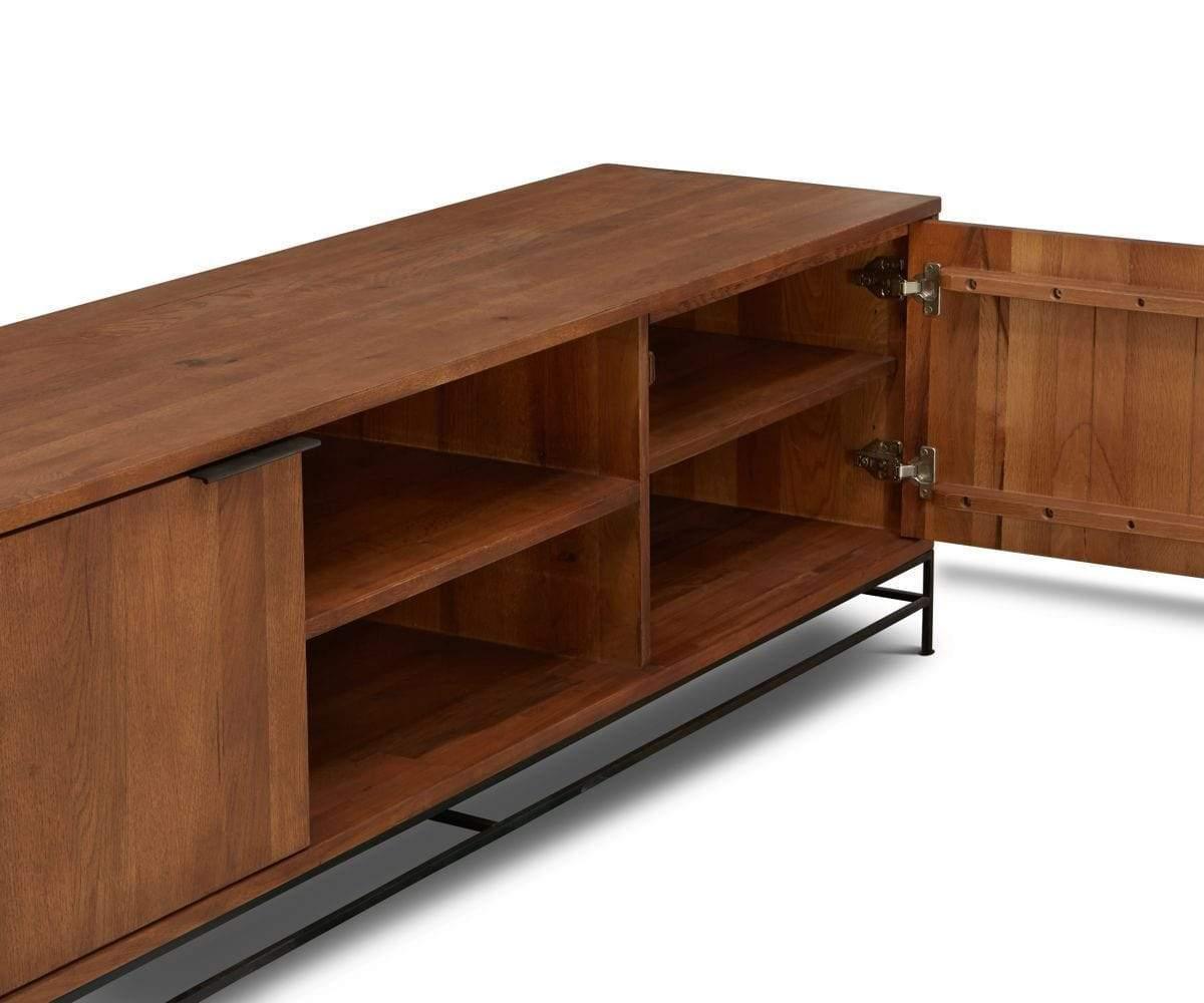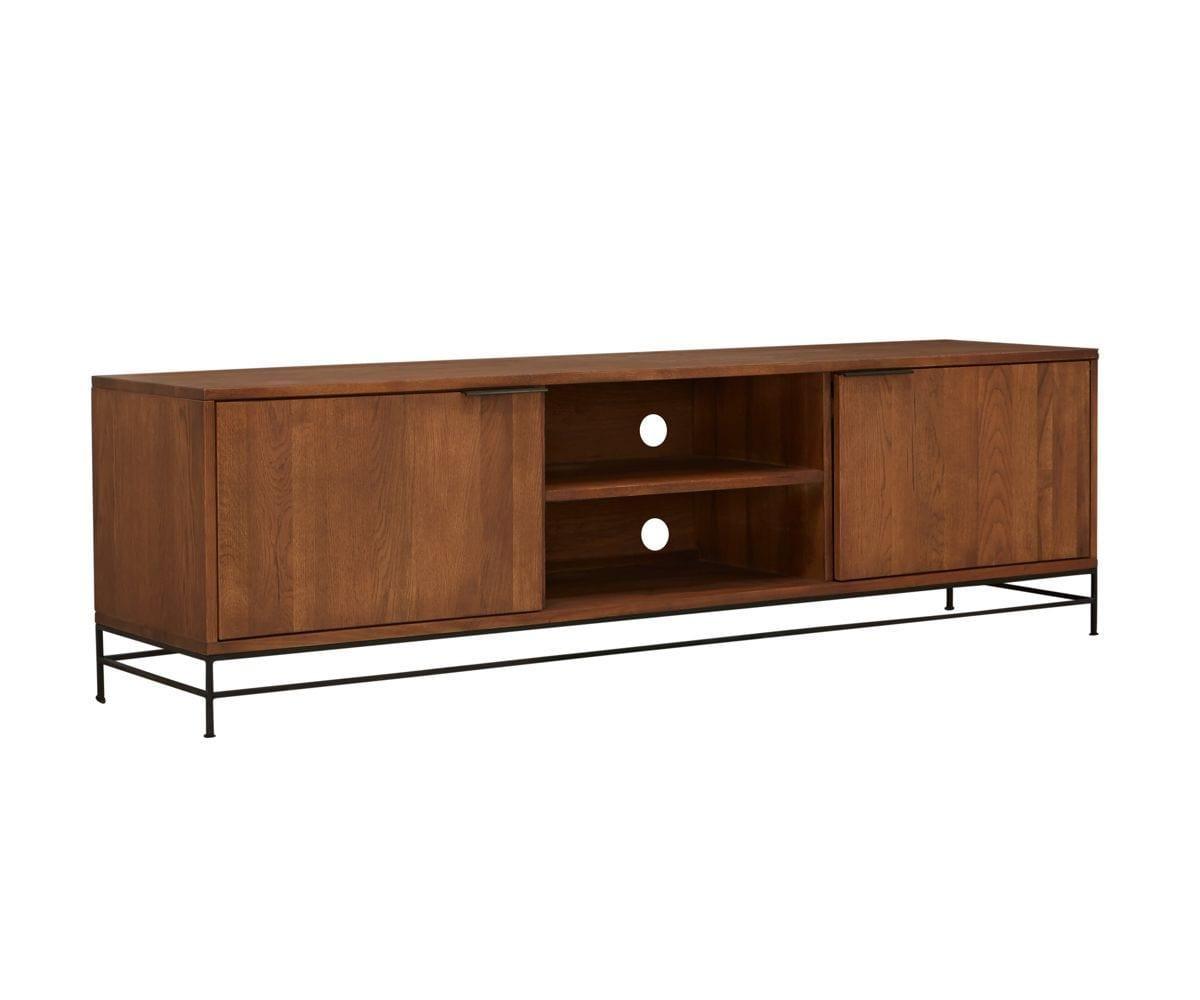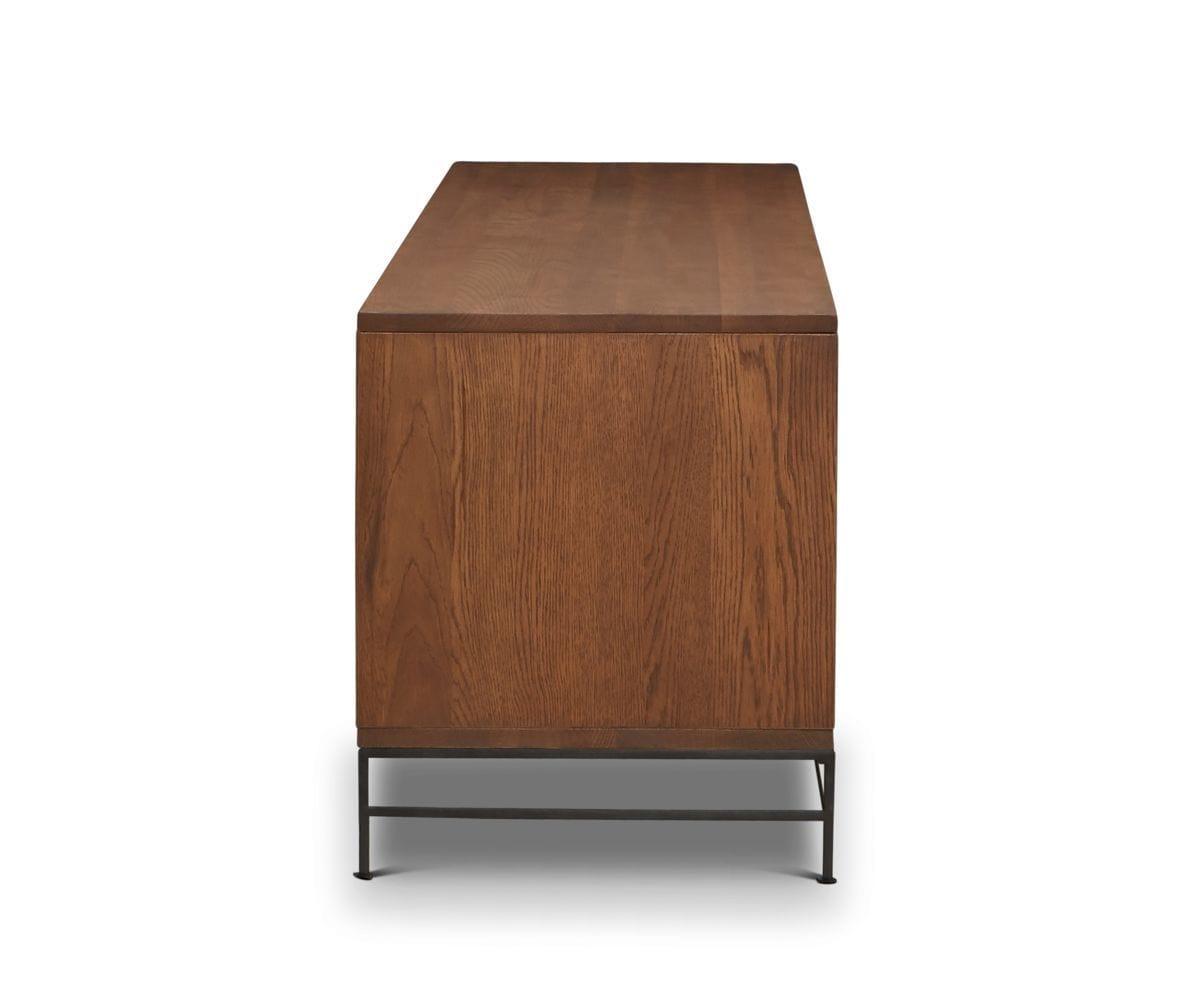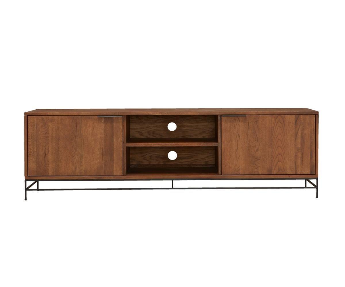 Le meuble multimédia Leende allie modernité et rusticité. Fabriqué en chêne européen massif, un bois dur riche et robuste, traditionnellement utilisé dans l'artisanat scandinave, il présente des fissures, des nœuds et des variations de couleur naturels qui rendent chaque pièce unique. La structure est en acier noirci pour une durabilité accrue. Ses angles nets et sa finition noircie lui confèrent une touche industrielle, avec des étagères réglables et des compartiments de rangement pratiques.