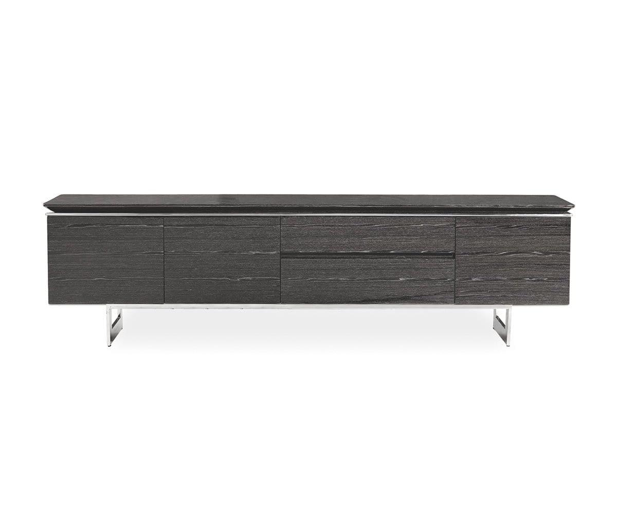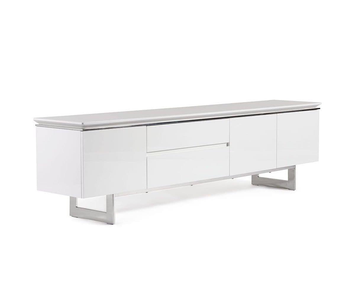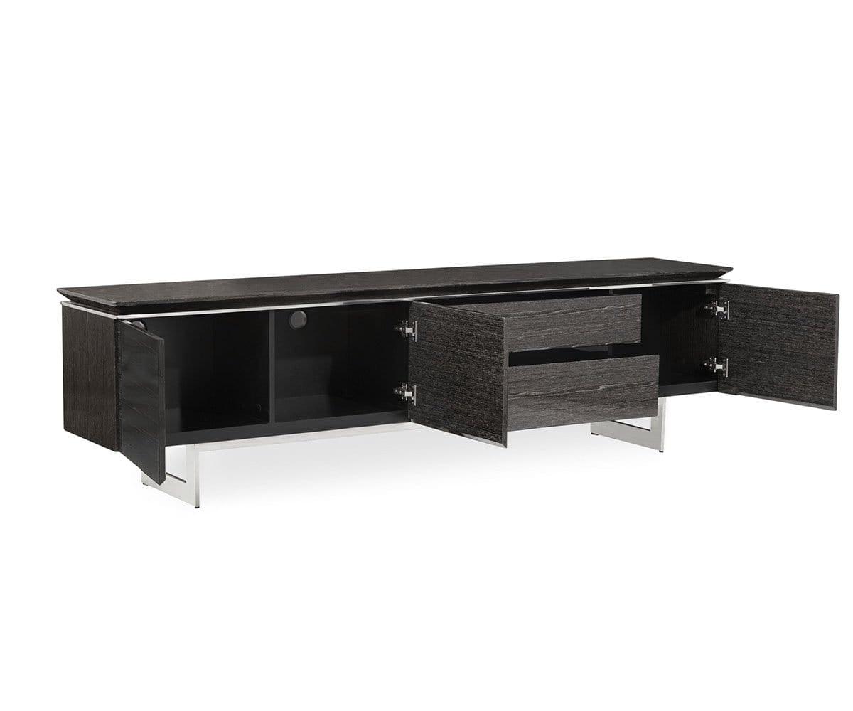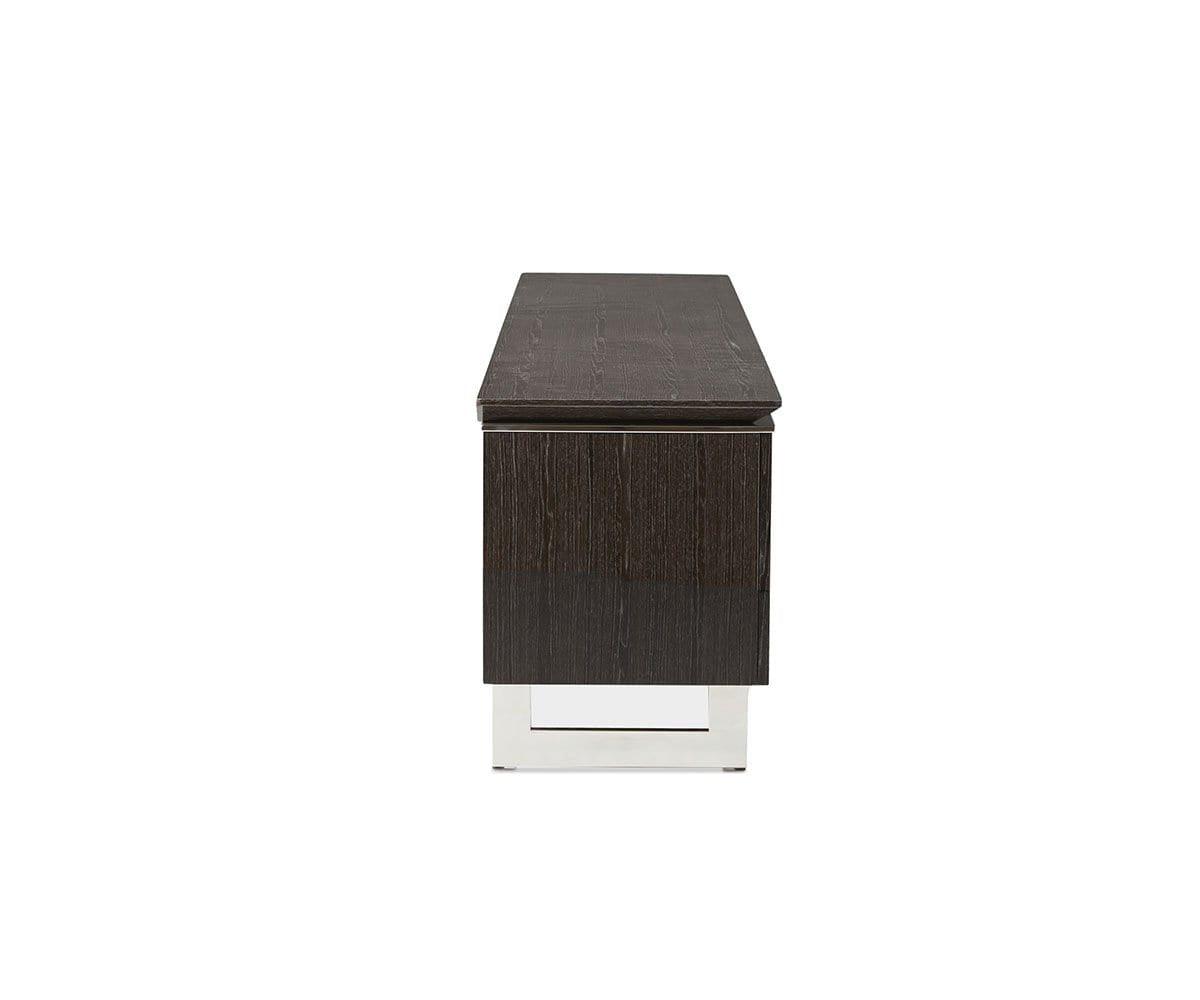 Le meuble multimédia Sieva, élégant et sophistiqué, offre un espace de rangement généreux. Sous tous les angles, ce meuble capte l'attention par ses lignes épurées, notamment son plateau biseauté intrigant et son piètement en acier inoxydable. Son motif bois saisissant est sublimé par une finition brillante contemporaine, qui lui permet de rayonner où que vous le placiez. Doté de trois portes qui s'ouvrent sur un grand espace de rangement et de deux tiroirs spacieux, ce meuble multimédia est conçu pour offrir un espace de rangement élégant pour tous vos appareils multimédias ou votre salon.