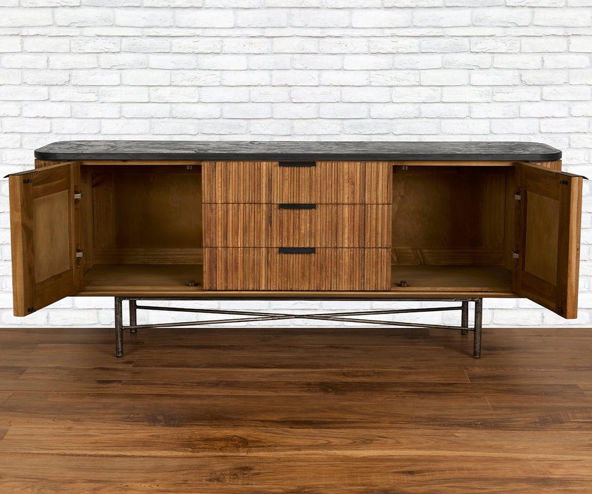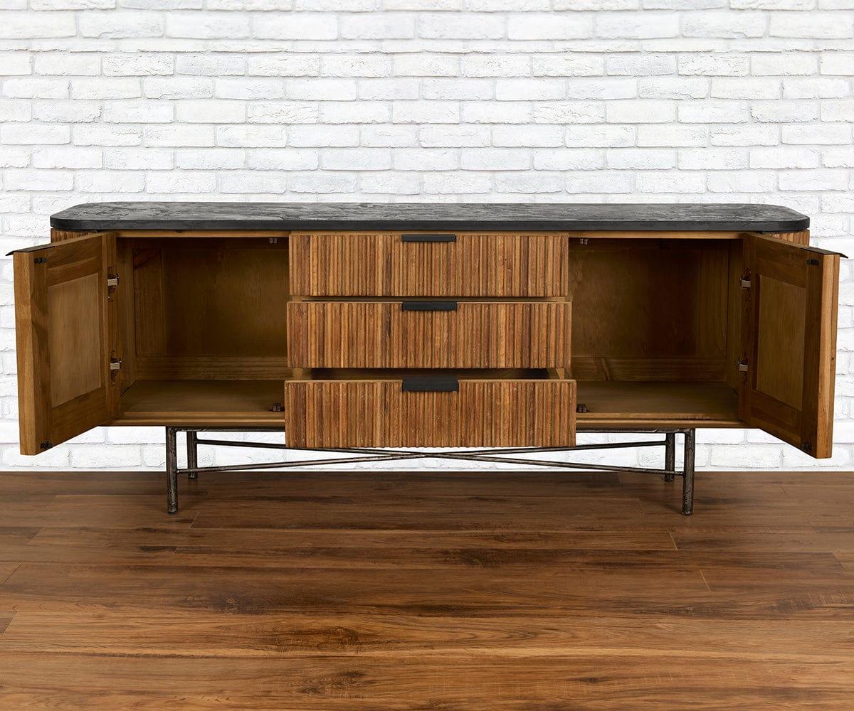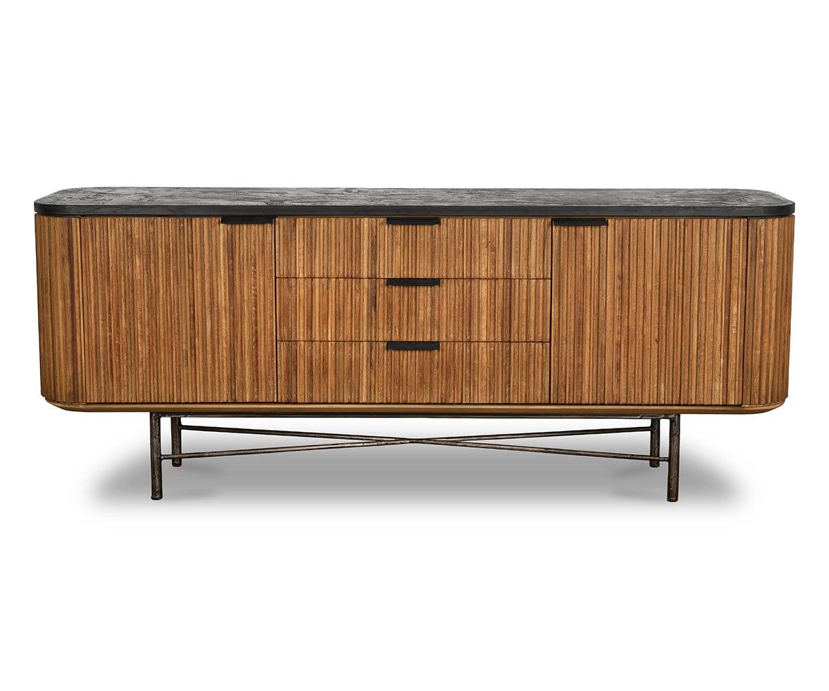 Avec son piètement cannelé en teck recyclé et son plateau noir mat, le meuble multimédia Taavi apporte une touche d'élégance inimitable au style classique du milieu du siècle. Deux portes, chacune dissimulant un compartiment spacieux, et trois tiroirs permettent de ranger vos essentiels. Le plateau texturé en Mortex, résistant à la chaleur et facile à nettoyer, est prêt à affronter les rigueurs du quotidien. Évitez de laisser une casserole humide directement sur le plateau de la table pendant une période prolongée ou utilisez un dessous-de-plat ou une autre protection. Les pieds et les touches métalliques noires complètent le style et ajoutent profondeur et dimension au teck durable. Associez-le aux autres pièces de la collection Taavi pour un look polyvalent, à la fois moderne et intemporel.