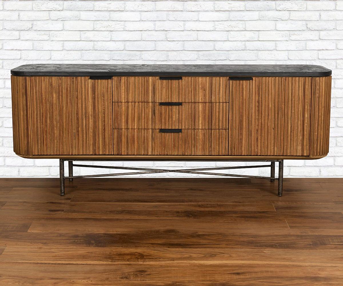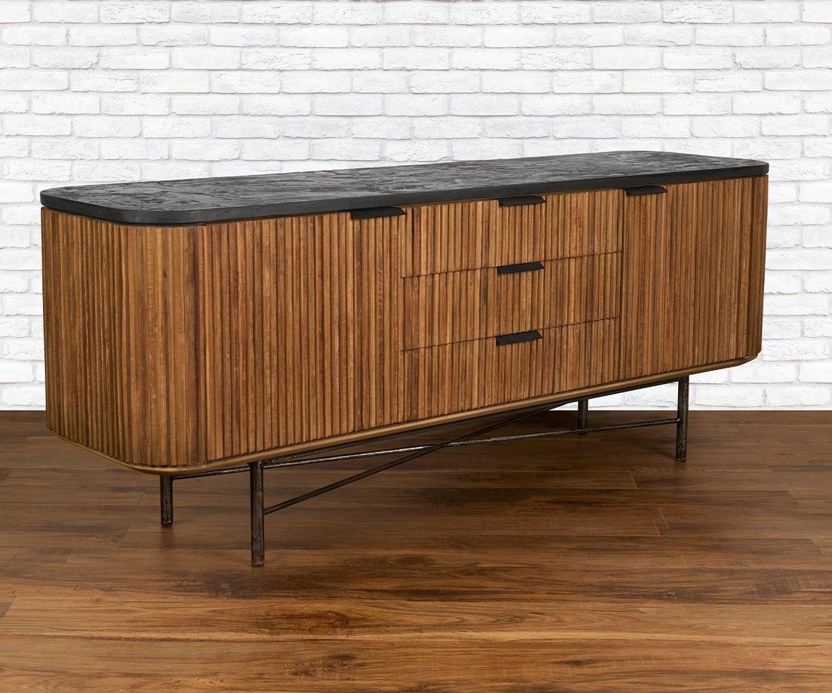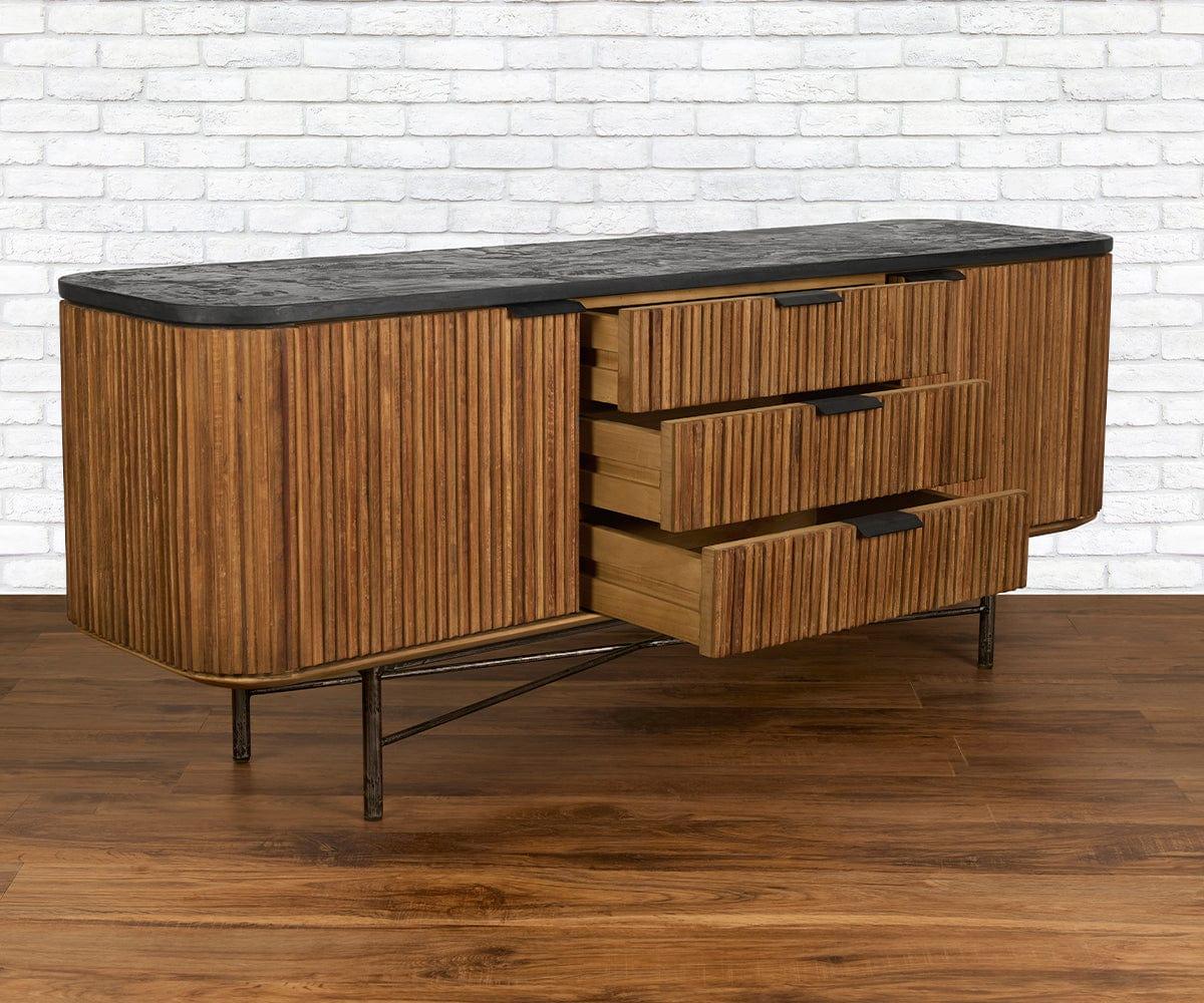 Avec son piètement cannelé en teck recyclé et son plateau noir mat, le meuble multimédia Taavi apporte une touche d'élégance inimitable au style classique du milieu du siècle. Deux portes, chacune dissimulant un compartiment spacieux, et trois tiroirs permettent de ranger vos essentiels. Le plateau texturé en Mortex, résistant à la chaleur et facile à nettoyer, est prêt à affronter les rigueurs du quotidien. Évitez de laisser une casserole humide directement sur le plateau de la table pendant une période prolongée ou utilisez un dessous-de-plat ou une autre protection. Les pieds et les touches métalliques noires complètent le style et ajoutent profondeur et dimension au teck durable. Associez-le aux autres pièces de la collection Taavi pour un look polyvalent, à la fois moderne et intemporel.