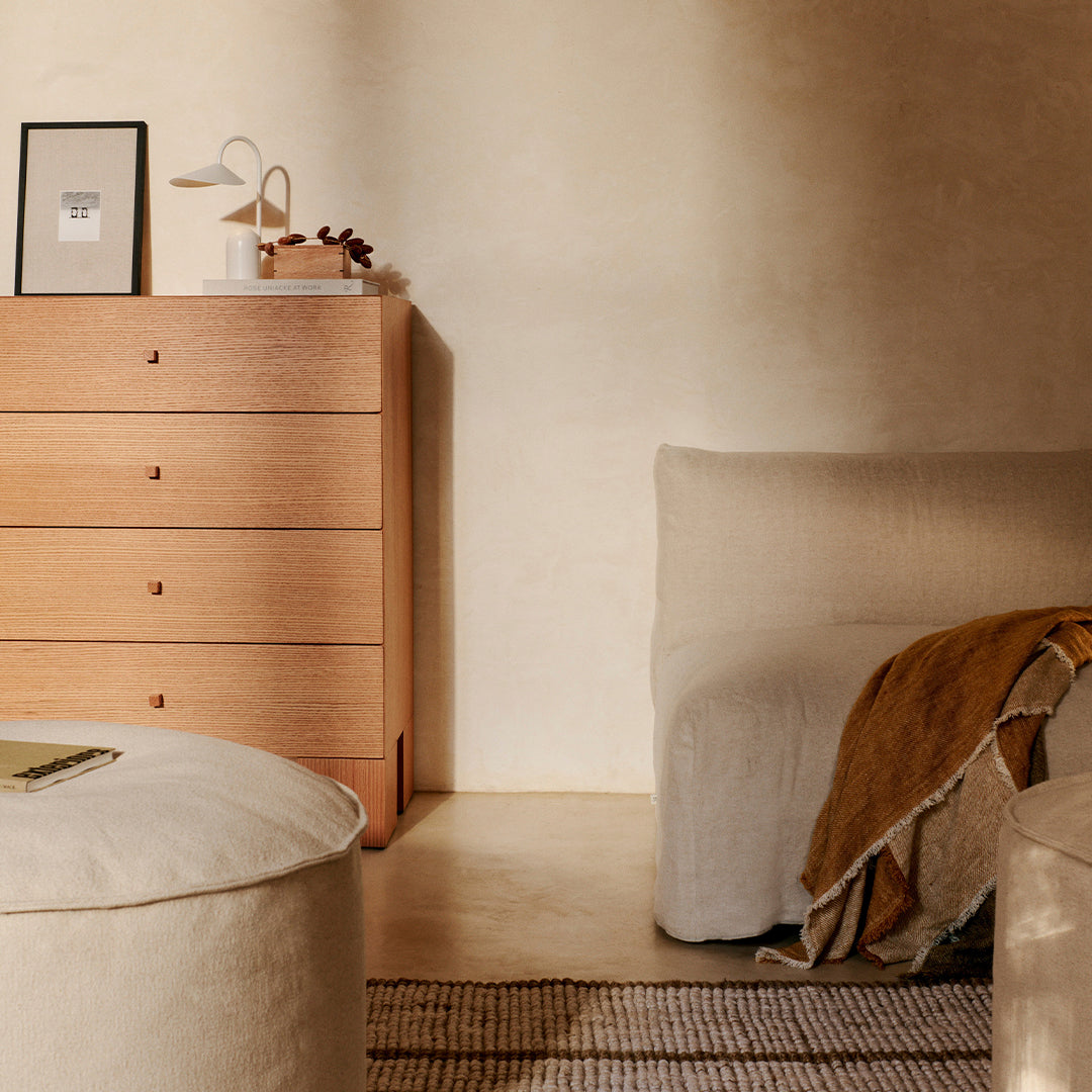 Les tiroirs Kuben sont fabriqués en placage de chêne naturel certifié FSC®. Leur forme cubique et nette, ainsi que leurs assemblages en onglet, créent l'illusion d'une boîte sans joint, tandis que leurs pieds cubiques surdimensionnés leur confèrent un caractère affirmé. Les poignées délicates apportent une touche raffinée, soulignant l'attrait ludique du design. Alliant fonctionnalité et esthétique minimaliste, ils offrent un espace de rangement généreux pour les vêtements et autres objets essentiels.