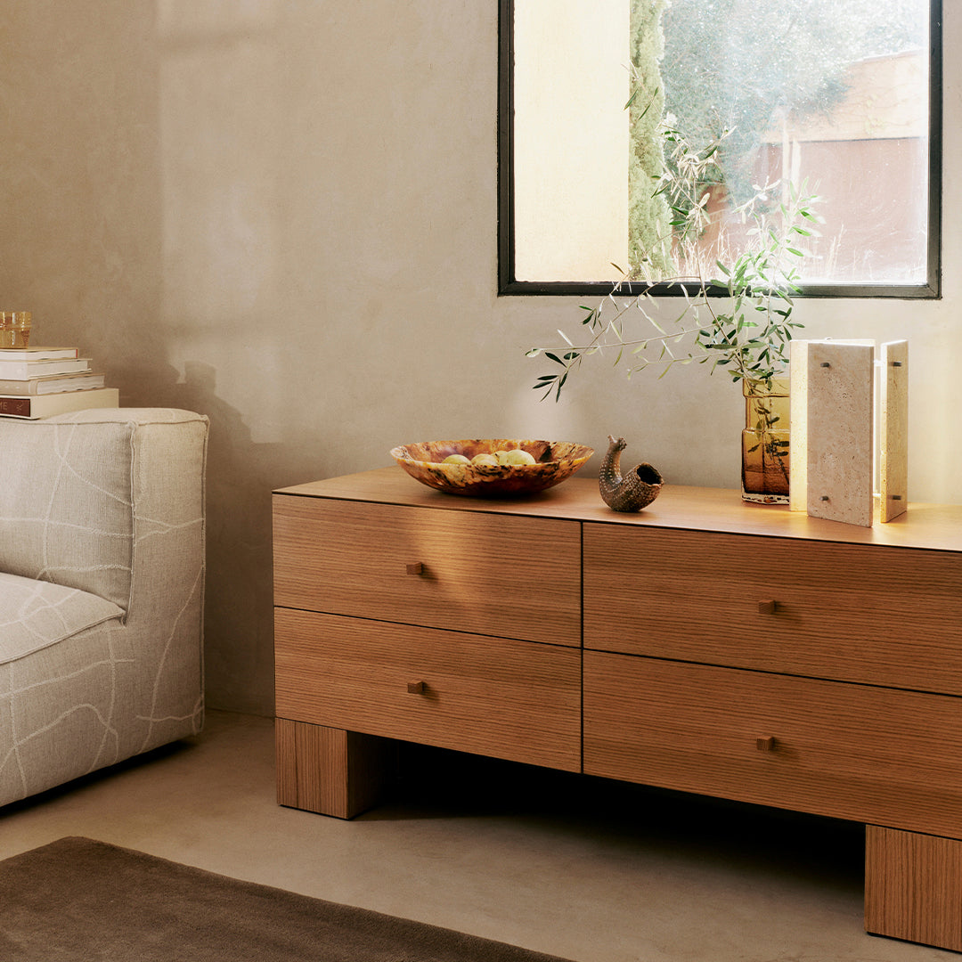 Les tiroirs Kuben sont fabriqués en placage de chêne naturel certifié FSC®. Leur forme cubique et nette, ainsi que leurs assemblages en onglet, créent l'illusion d'une boîte sans joint, tandis que leurs pieds cubiques surdimensionnés leur confèrent un caractère affirmé. Les poignées délicates apportent une touche raffinée, soulignant l'attrait ludique du design. Alliant fonctionnalité et esthétique minimaliste, ils offrent un espace de rangement généreux pour les vêtements et autres objets essentiels.