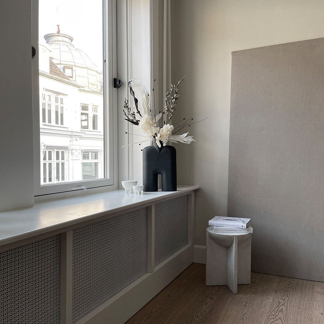 Avec ses formes géométriques et ses lignes nettes, Cross s'inspire du minimalisme architectural et cherche à créer une table à la fois simple et sculpturale en marbre massif. Développée en étroite collaboration avec des fournisseurs de marbre indiens, cette table d'appoint recherche une pierre parfaitement homogène. Chaque table en marbre massif révèle ainsi de subtils contrastes de texture, une surface aux magnifiques tons terre délavés et une finition mate. Cross peut être utilisée aussi bien comme table d'appoint que comme tabouret. Design : Kristian Sofus Hansen et Tommy Hyldahl.