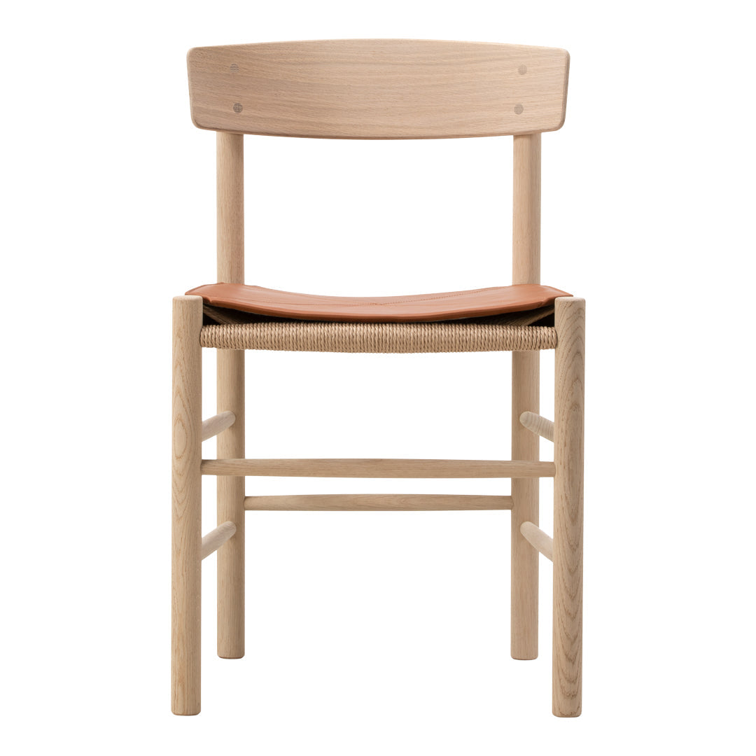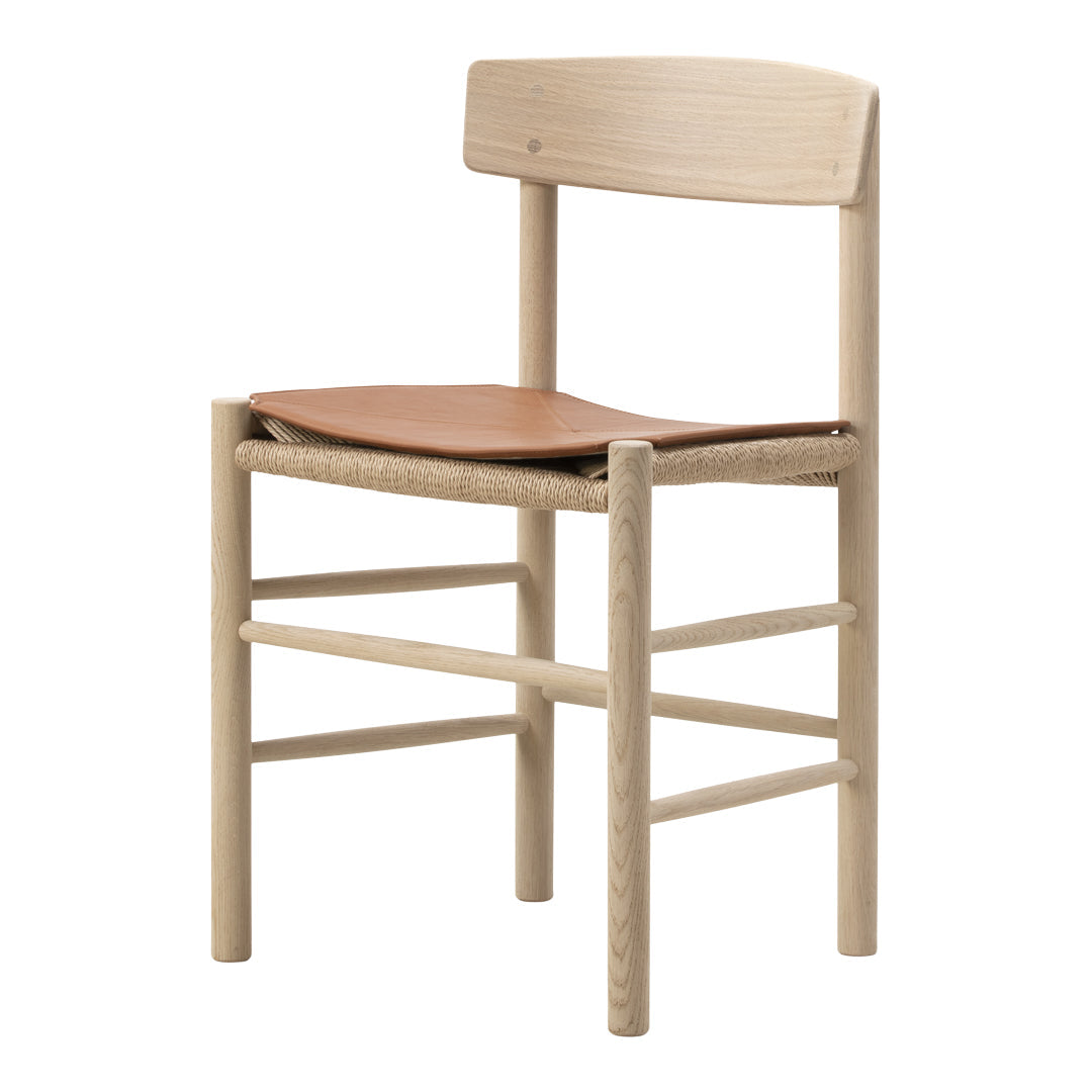 Le nouveau coussin en cuir du fauteuil J39 utilise des chutes de cuir auparavant impossibles à utiliser en raison de leurs formes irrégulières résultant de la production de canapés de plus grande taille. Le coussin est spécialement conçu pour intégrer une forme triangulaire typique de surplus de cuir, qui, à première vue, ressemble simplement aux diagonales classiques en corde de papier du J39. Ce choix de design s'inscrit ainsi dans la volonté de réduire les déchets de production de matériaux de haute qualité.