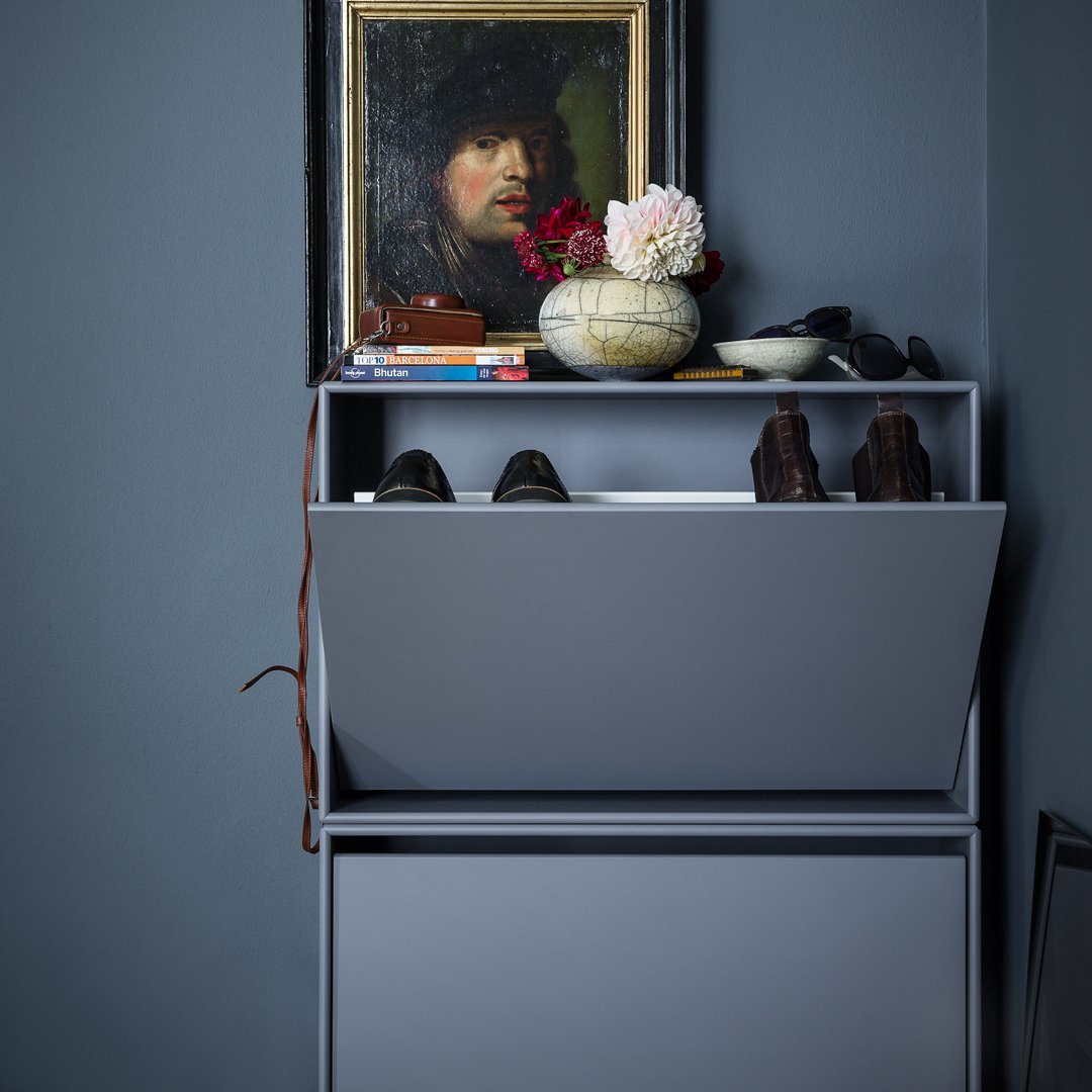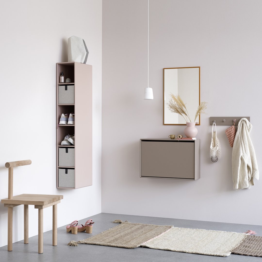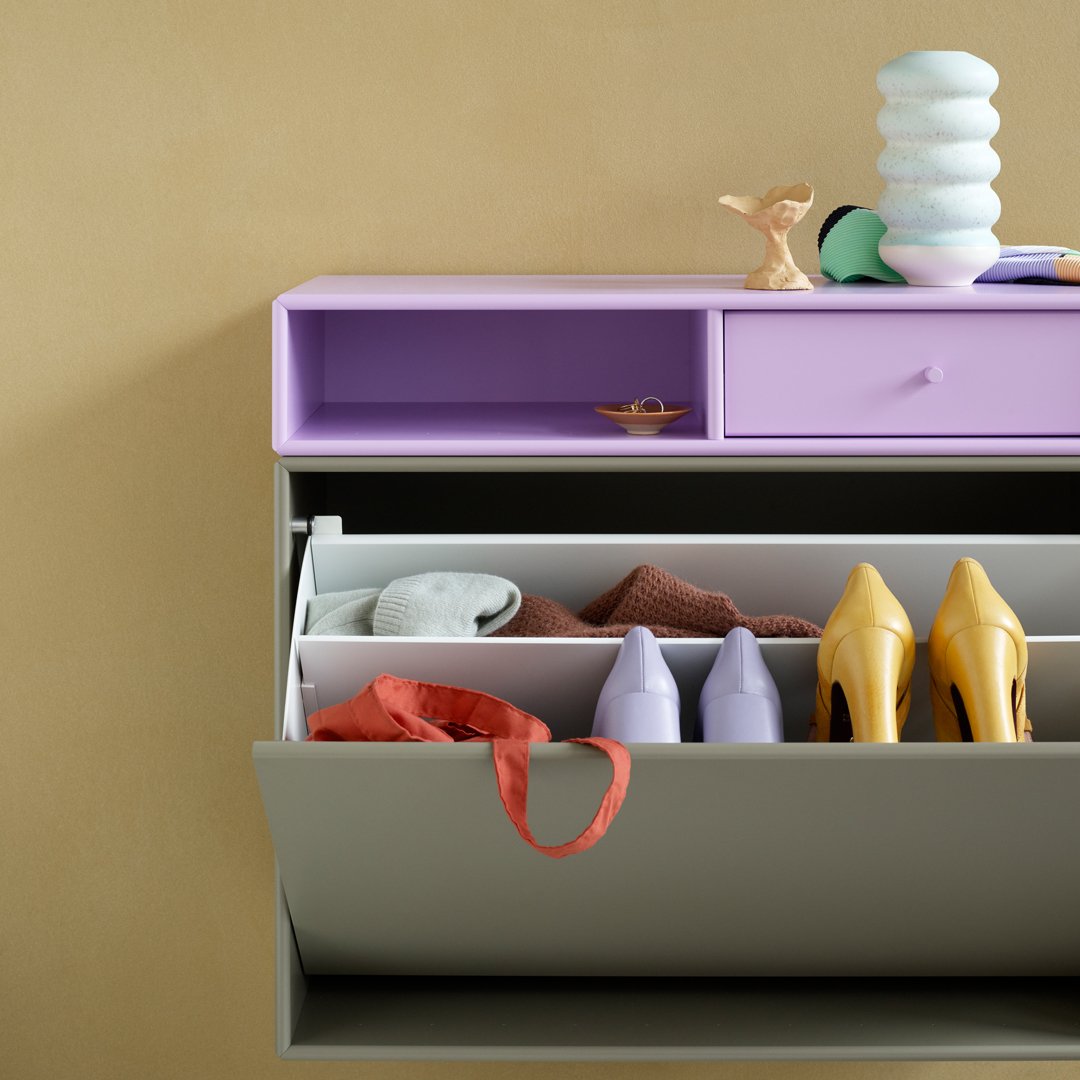 HIDE est idéal pour les petites entrées où ranger chaussures, gants et autres accessoires est essentiel pour que tout soit bien rangé. HIDE est un meuble à chaussures polyvalent doté d'un tiroir rabattable et d'un tapis intérieur en plastique pour une protection contre la saleté et les rayures. Ce petit meuble d'entrée est disponible en profondeur 20 cm et peut accueillir 2 à 3 paires de chaussures. Placez un meuble d'entrée seul ou créez une solution verticale ou horizontale avec plusieurs meubles. Ce meuble étroit peut bien sûr être utilisé dans d'autres pièces que l'entrée, par exemple sous un miroir de maquillage pour ranger des accessoires. HIDE est disponible uniquement avec des rails de suspension. Choisissez parmi 40 coloris de laque Montana.