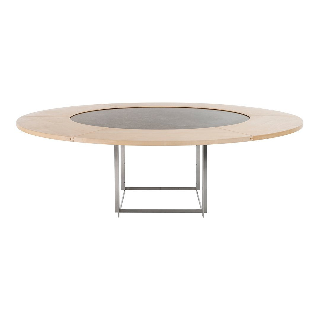 La rallonge PK54A? offre une solution unique pour ceux qui souhaitent agrandir la table ronde PK54?. La pierre rencontre le bois, le dur rencontre le doux : la table change radicalement d'apparence grâce à la rallonge en bois. Idéale pour les assiettes autour de la table, elle apporte une touche d'élégance à votre décoration.