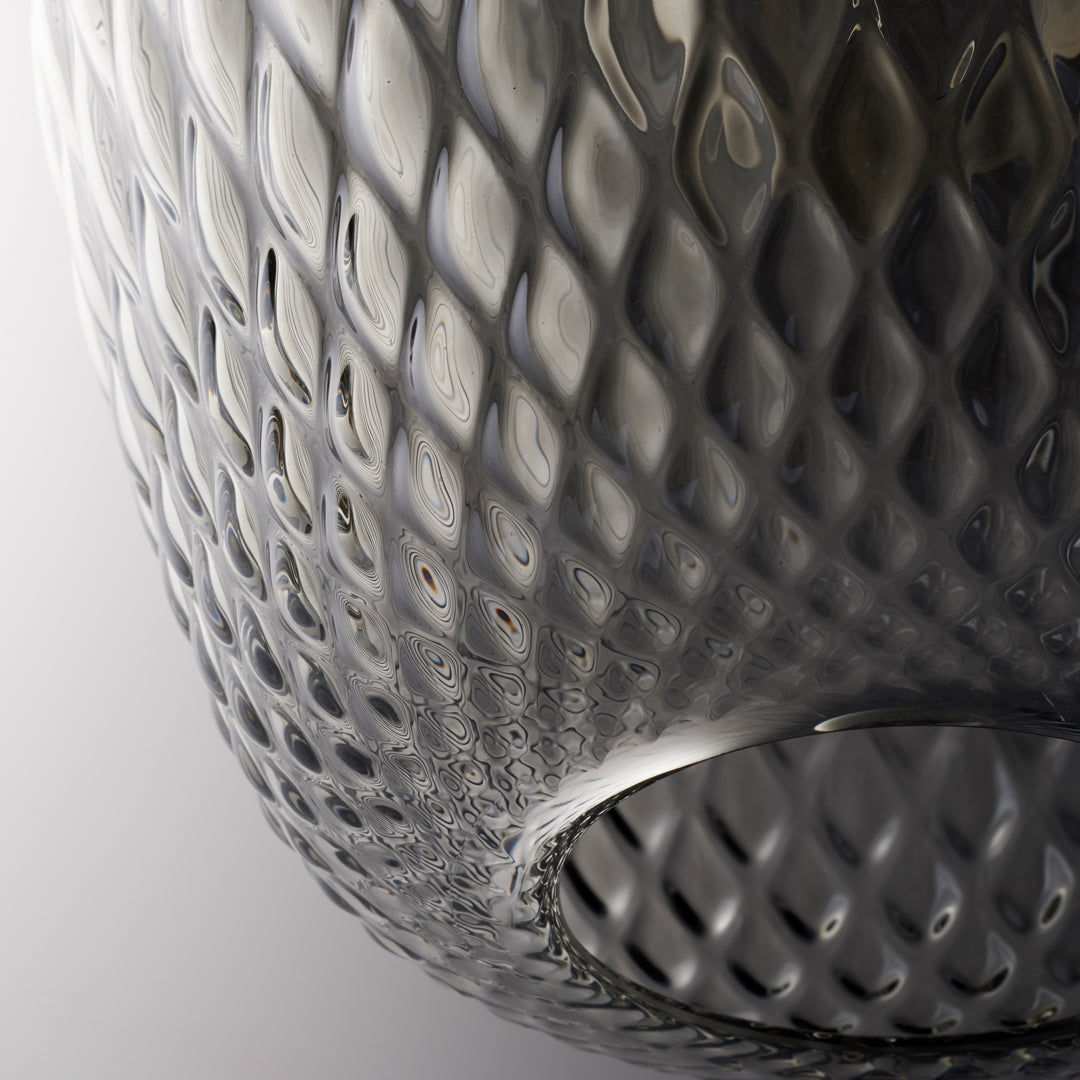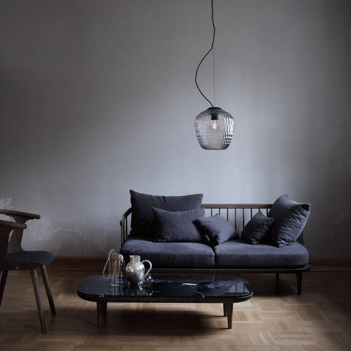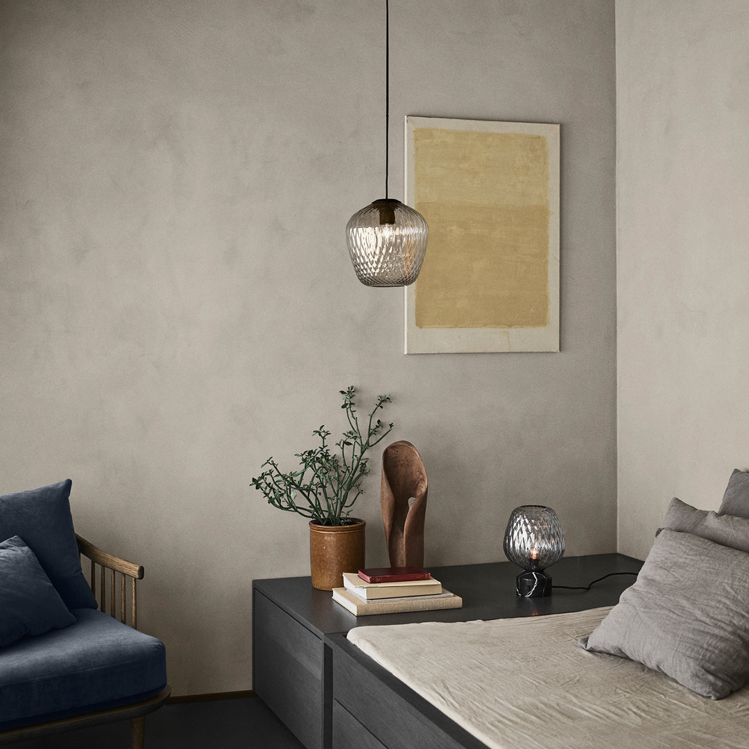 Blown est la première lampe de Samuel Wilkinson pour &tradition. Cette suspension soufflée à la bouche au motif matelassé est disponible en deux versions : une version translucide au lustre argenté et une version opale. Elle est montée sur une suspension en métal moulé thermolaqué. Conçue comme une exploration des reflets, des distorsions et des réfractions d'une source lumineuse entourée de verre à motifs, Blown est une œuvre d'art. Wilkinson explique la diversité de ses inspirations pour développer Blown : « Comme pour tout projet, on part d'une idée, puis on regarde le monde à travers une sorte de filtre. J'ai observé des céramiques anciennes, de vieux morceaux de verre, des lentilles de lampes très anciennes, des phares, et même une bouteille miroir, juste pour voir comment la lumière s'en dégage. » Wilkinson s'est même inspiré des graines et des baies, notamment des framboises, pour la texture matelassée du verre. Blown est une pièce remarquable en solo, mais fonctionne aussi bien en groupe qu'en succession. Les deux versions s'adaptent à une gamme d'intérieurs, la variante sablée offrant une lueur subtile et sophistiquée, tandis que la version translucide transforme l'espace qu'elle habite avec ses textures et ses motifs complexes.