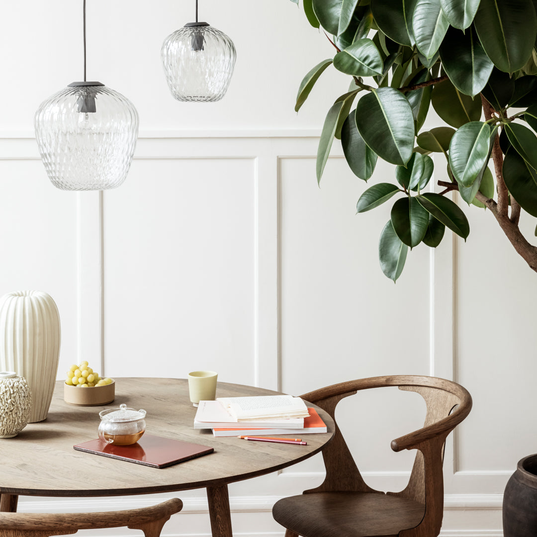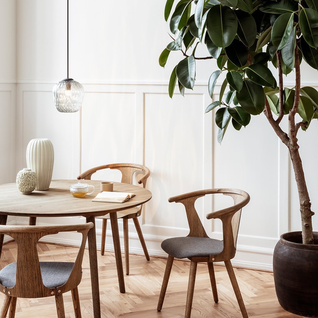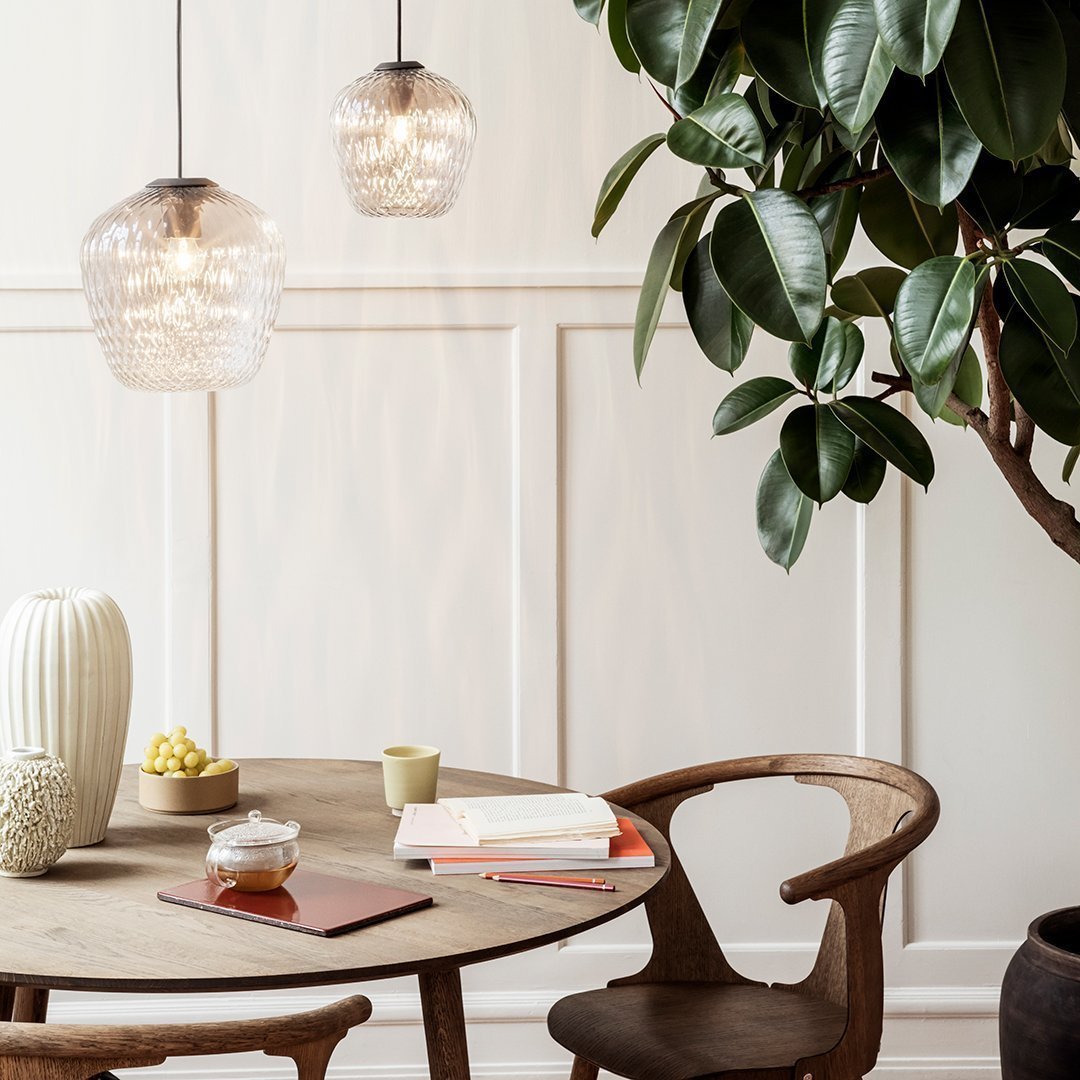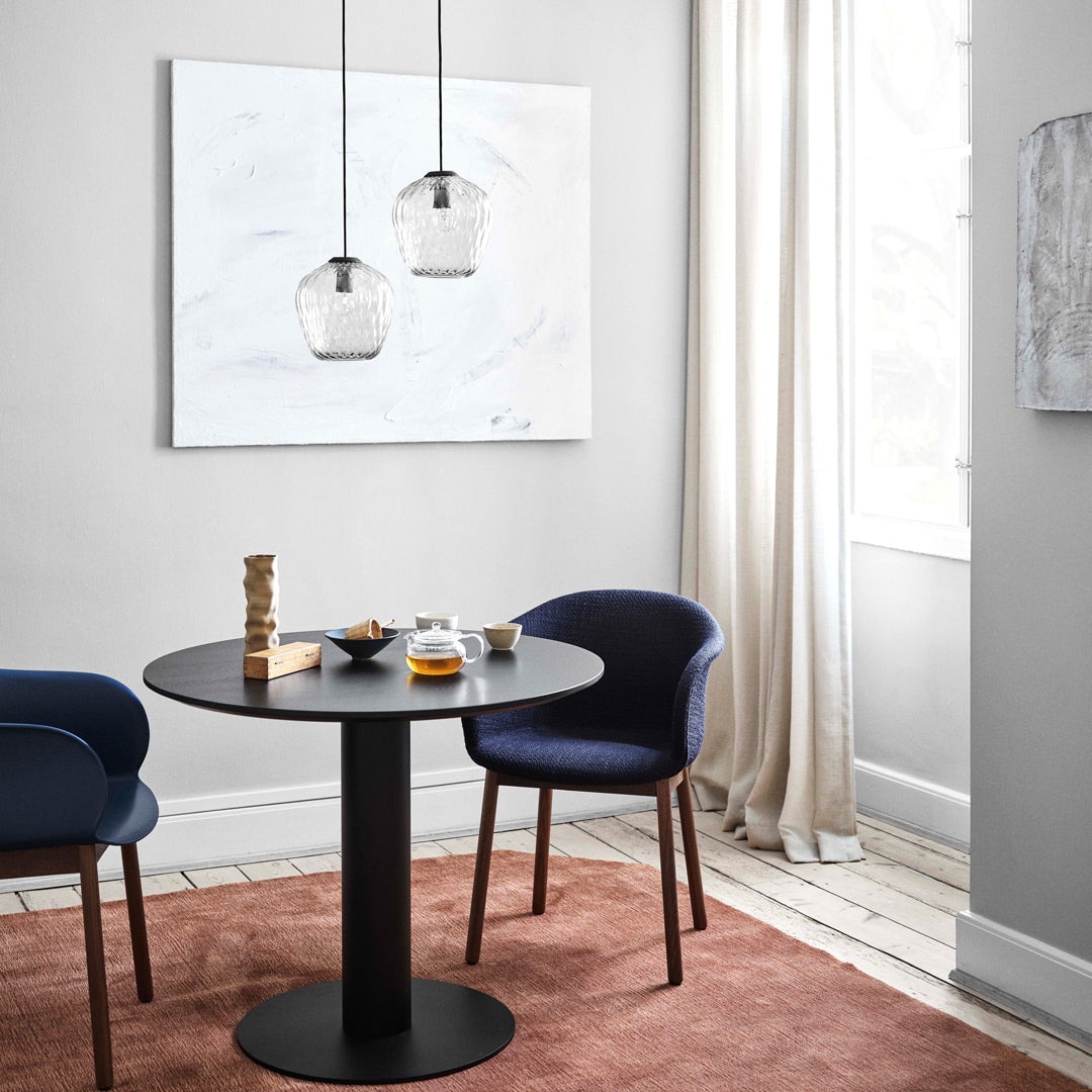 Blown est la première lampe de Samuel Wilkinson pour &tradition. Cette suspension soufflée à la bouche au motif matelassé est disponible en deux versions : une version translucide au lustre argenté et une version opale. Elle est montée sur une suspension en métal moulé thermolaqué. Conçue comme une exploration des reflets, des distorsions et des réfractions d'une source lumineuse entourée de verre à motifs, Blown est une œuvre d'art. Wilkinson explique la diversité de ses inspirations pour développer Blown : « Comme pour tout projet, on part d'une idée, puis on regarde le monde à travers une sorte de filtre. J'ai observé des céramiques anciennes, de vieux morceaux de verre, des lentilles de lampes très anciennes, des phares, et même une bouteille miroir, juste pour voir comment la lumière s'en dégage. » Wilkinson s'est même inspiré des graines et des baies, notamment des framboises, pour la texture matelassée du verre. Blown est une pièce remarquable en solo, mais fonctionne aussi bien en groupe qu'en succession. Les deux versions s'adaptent à une gamme d'intérieurs, la variante sablée offrant une lueur subtile et sophistiquée, tandis que la version translucide transforme l'espace qu'elle habite avec ses textures et ses motifs complexes.