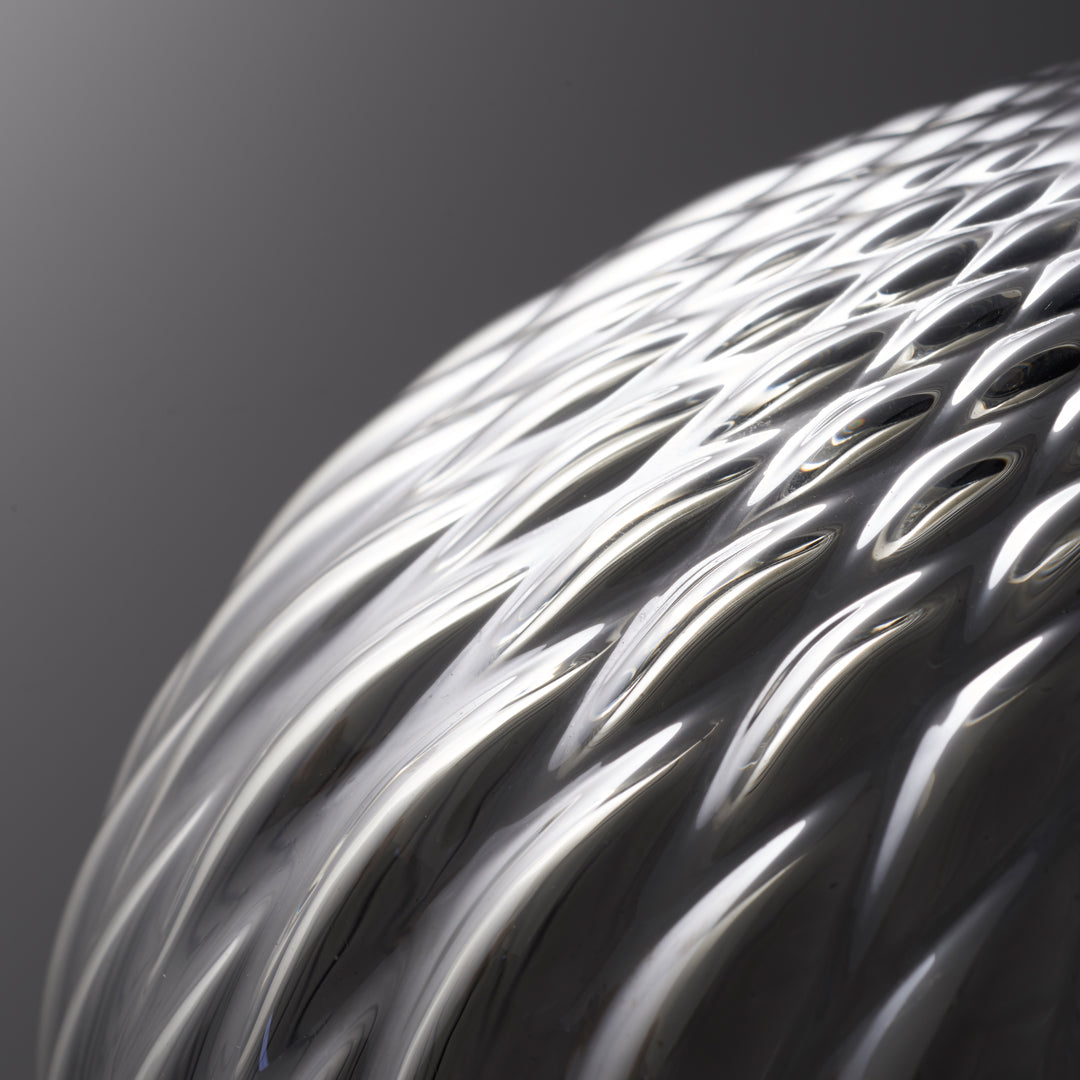 La texture du verre a été initialement obtenue par conception assistée par ordinateur (CAO) afin de contrôler précisément le gonflement de chaque bulle. Lors de la production, le verre est soufflé dans un moule et fabriqué à la main par des artisans qualifiés. Le système de suspension est en métal moulé thermolaqué et équipé d'un fil de sécurité qui soutient le poids de la suspension. Ce fil sert également de point d'équilibre pour garantir une suspension toujours horizontale.